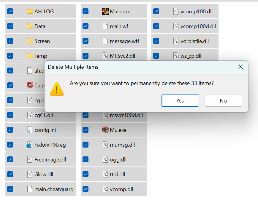 - Cách 2: Vào thư mục chứa game bằng File Explorer, Chọn tất cả các file trong thư mục MU Thiên Tử rồi bấm Shift + DEL trên bàn phím, chọn Yes